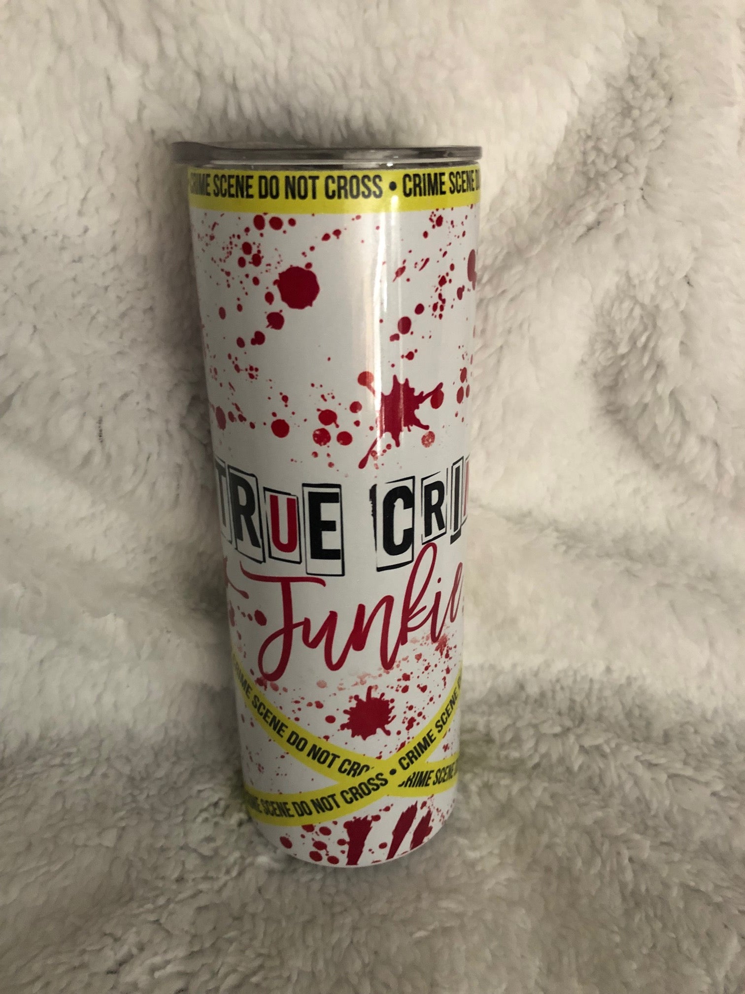 True Crime Junkie 20 oz glow in the dark Tumbler. Comes with a metal and plastic straw. This will keep your drink hot or cold for hours.