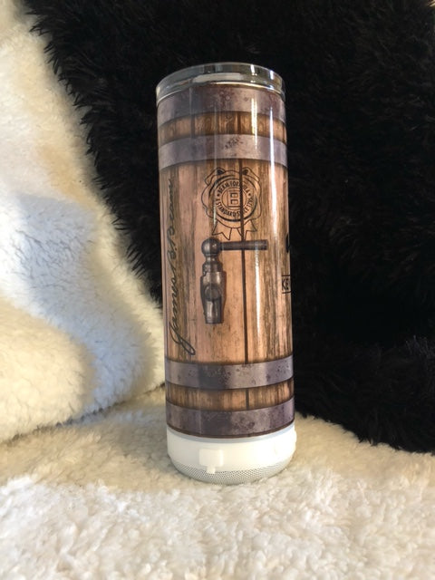 20 oz Stainless Steel Blue Tooth Speaker cup with plastic closable lid. Will keep your drink ice cold or streaming hot. Comes with a plastic straw.