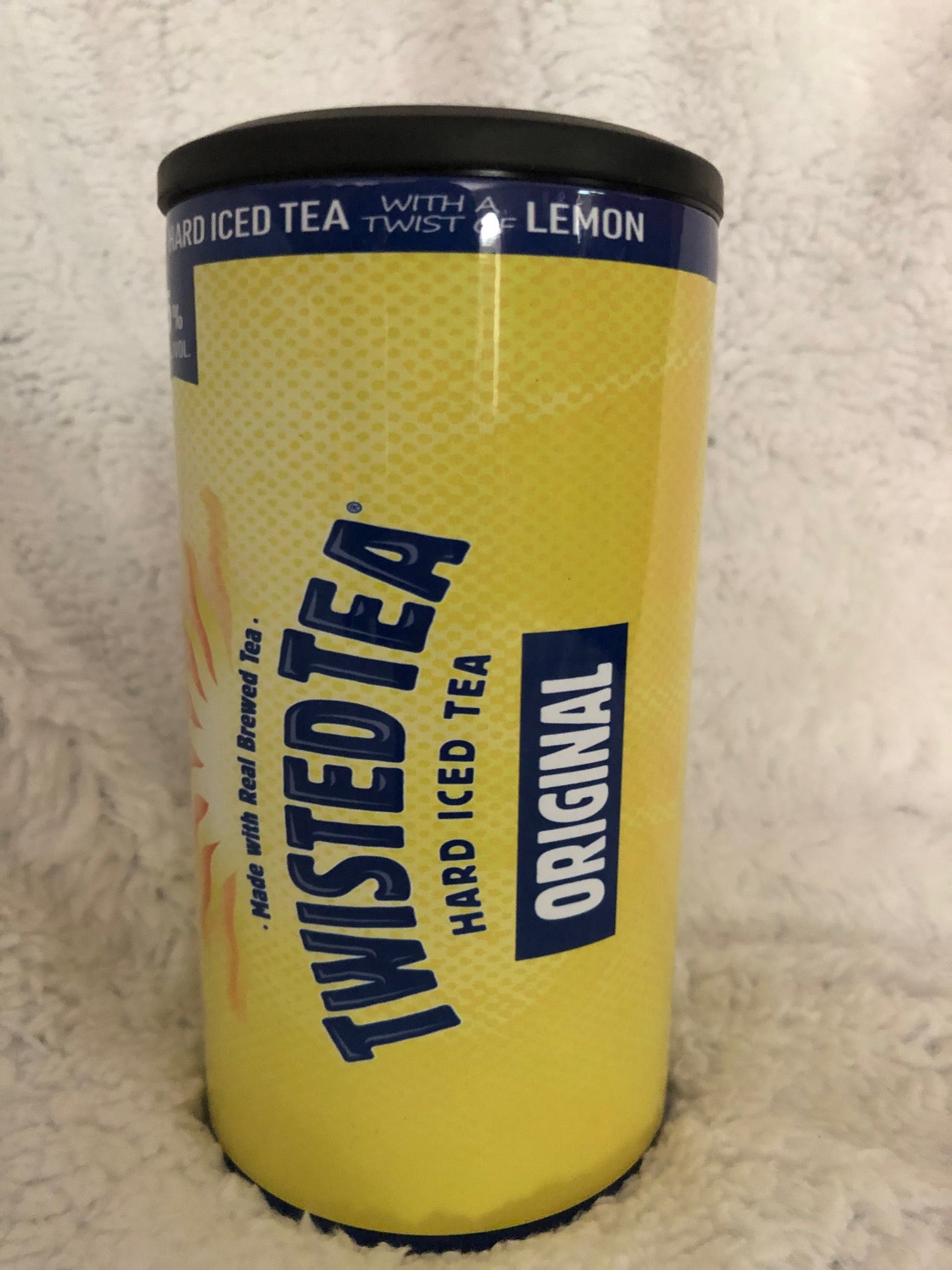 Twisted Tea 4 in 1 Coozie/ Tumbler Combo. Holds a slim can, a regular can, a bottle and comes with a separate lid and straw to make it a tumbler. This will keep your drink ice cold for hours.
