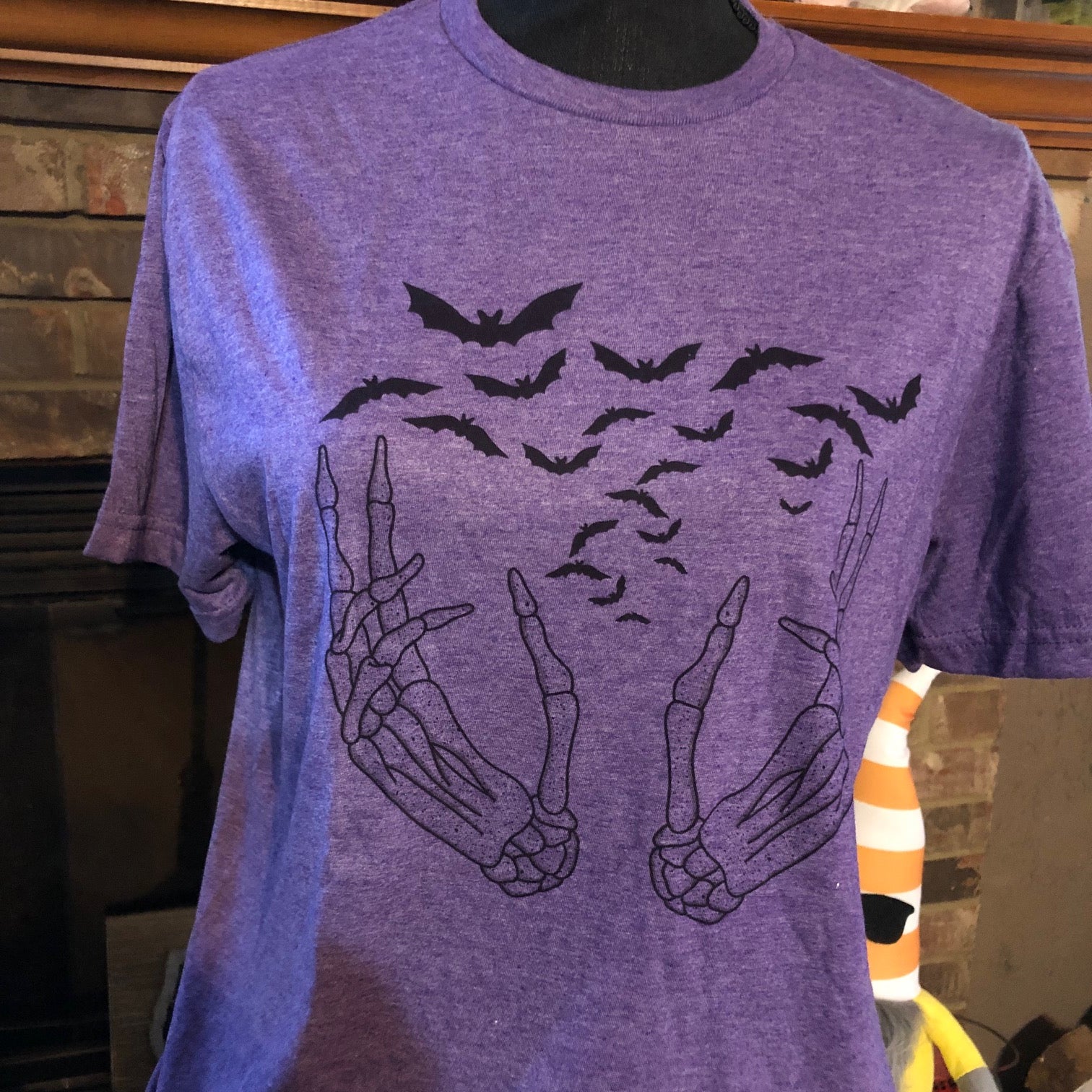 Short sleeve skeleton hand and bats unisex sublimation t-shirt. Super soft.